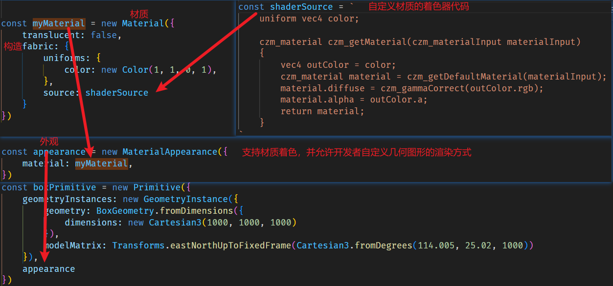 - czm_modelMaterial:结构体定义了一个用于3D模型材质的属性集合,这些属性通常用于计算机图形学中,以模拟物体表面的外观和光照效果。
