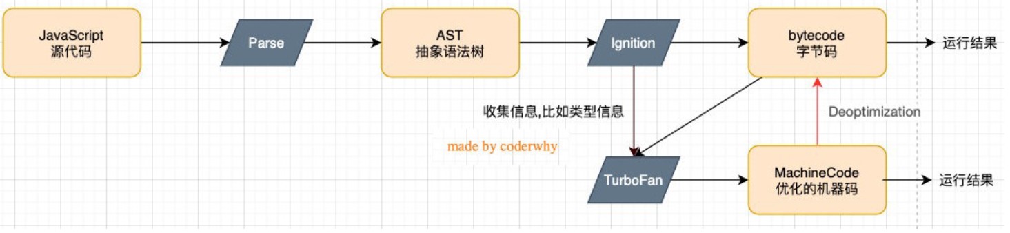 热点函数,那么就会经过TurboFan转换成优化的机器码,提高代码的执行性能; - 但是,机器码实际上也会被还原为ByteCode,这是因为如果后续执行函数的过程中,类型发生了变化(比如sum函数原来执行的是number类型,后来执行变成了string类型),之前优化的机器码并不能正确的处理运算,就会逆向的转换成字节码;