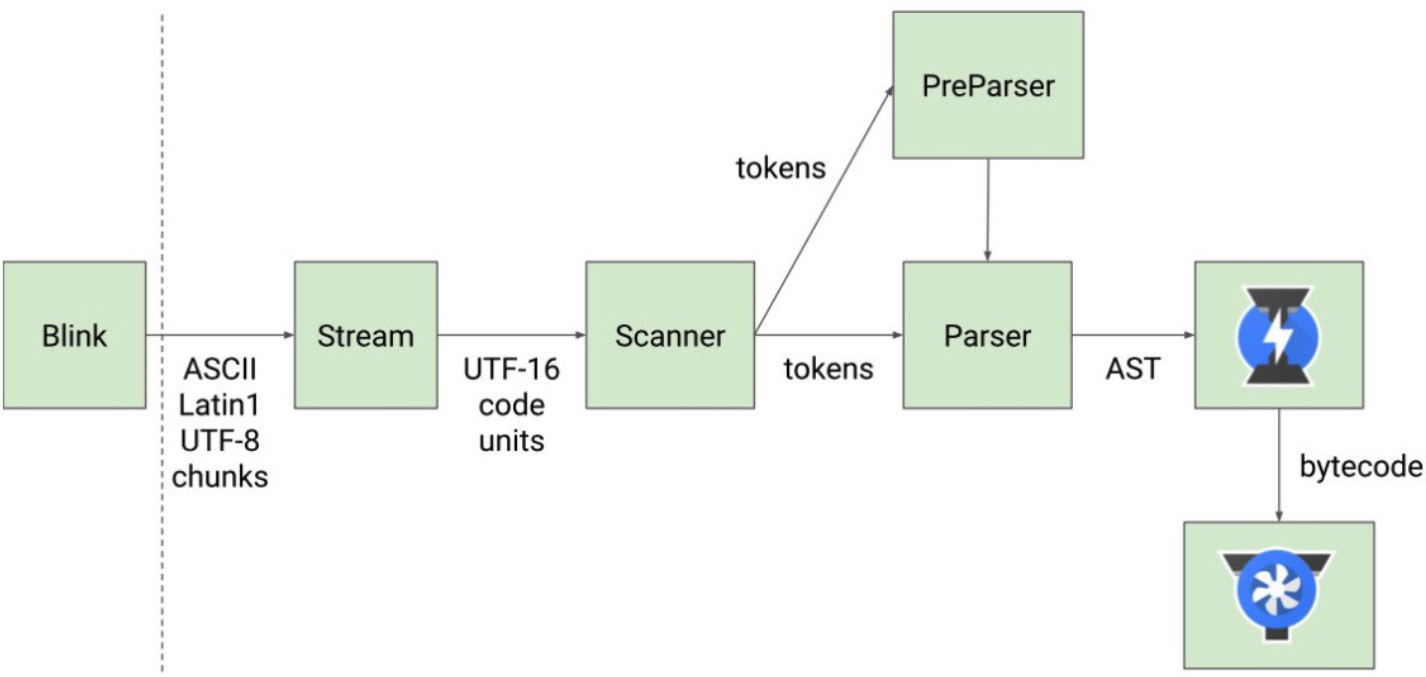 - Blink将源码交给V8引擎,Stream获取到源码并且进行编码转换;