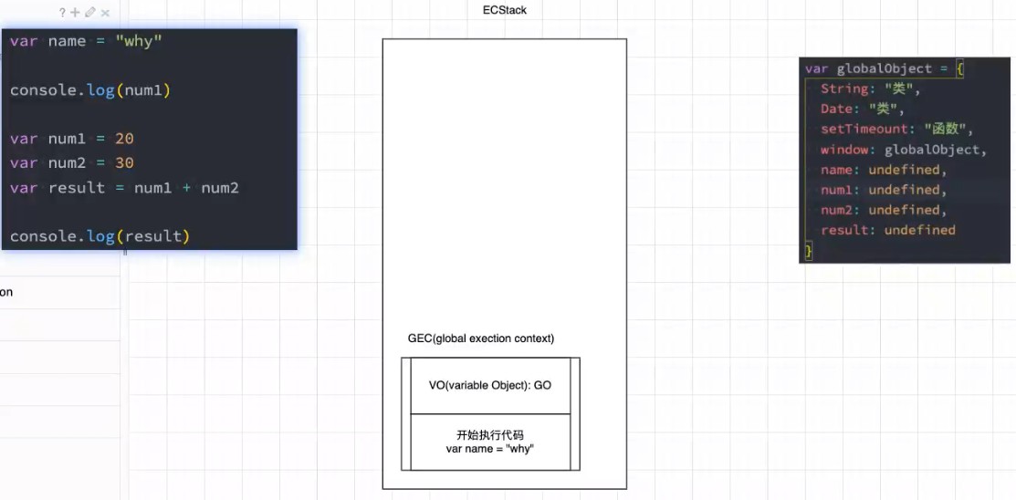 globalObject,将代码中的var变量属性值都写入 - 在执行到该行代码就会赋值或者操作,如果提前打印或者使用,也不会报错