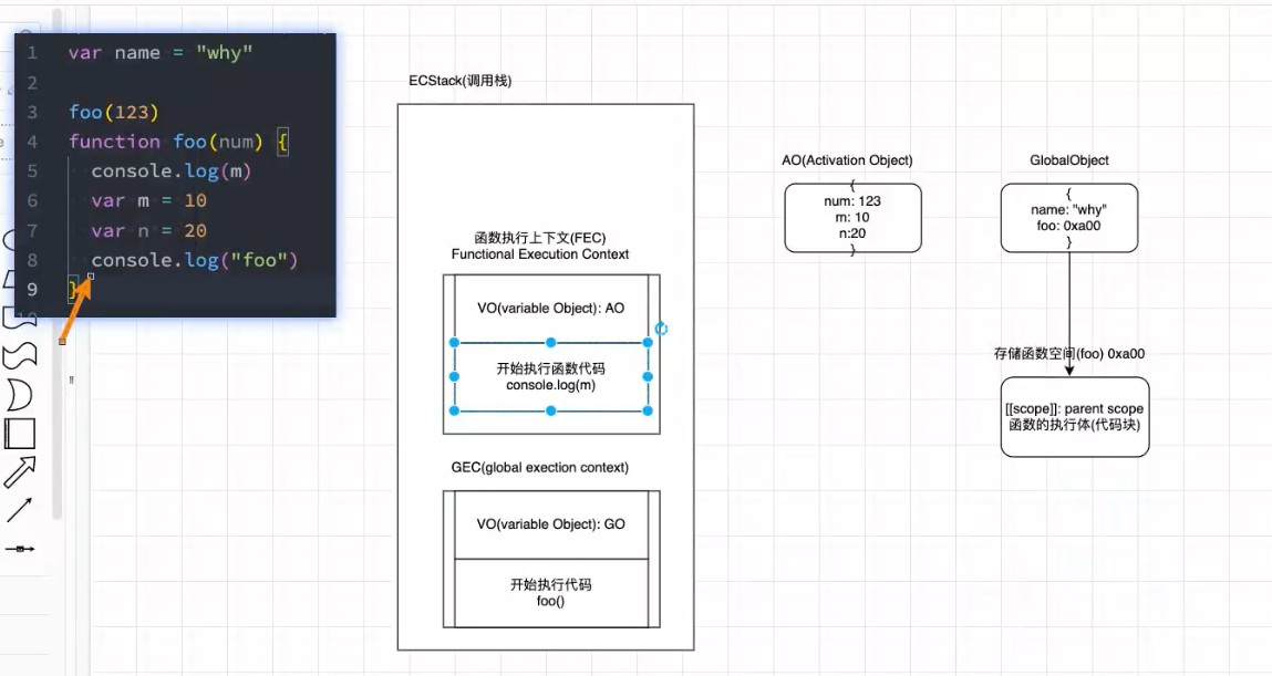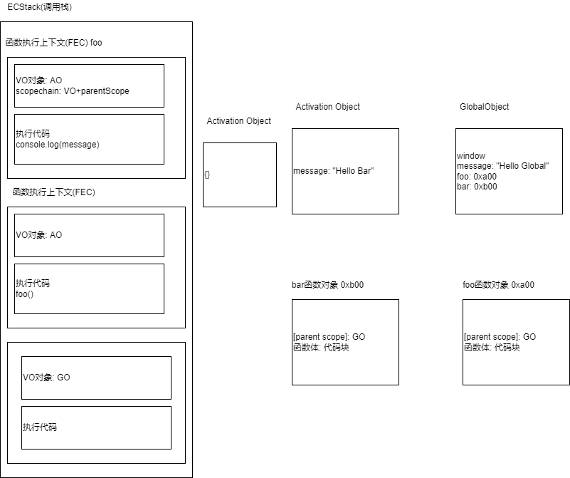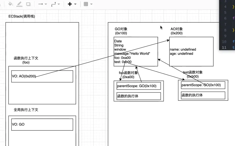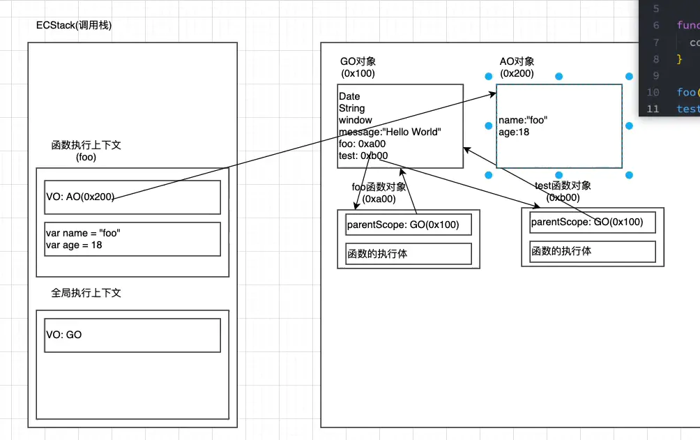 函数执行体(函数代码)。 解析test是函数,就创建一个函数对象test(oxb00),里面有函数的父级作用域,也就是全局的GO对象 (ox100),还有函数执行体接下来执行执行代码,先给message赋值,变成了hello,然后执行函数foo。