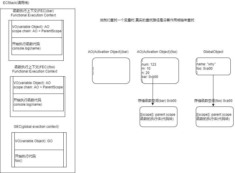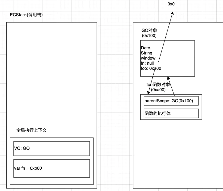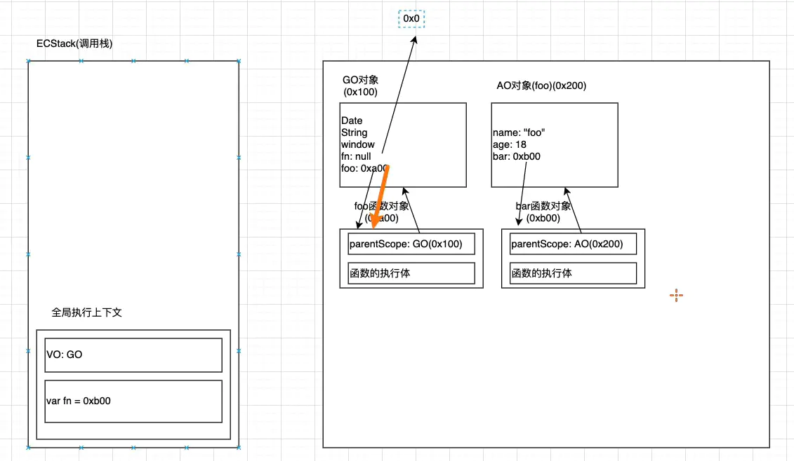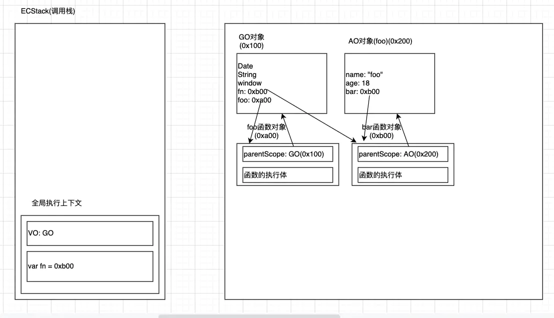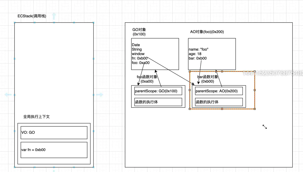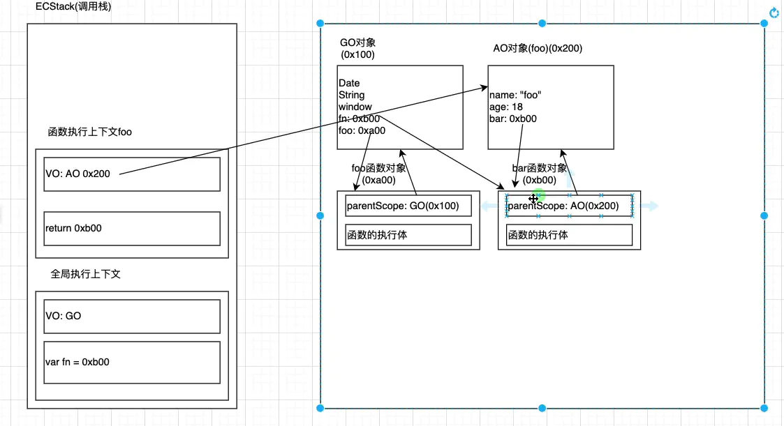 - foo函数执行完之后,栈里面的foo函数执行上下文就会被销毁,一旦销毁,对foo的AO对象的引用将会没有,然后ox2oo就会被销毁。