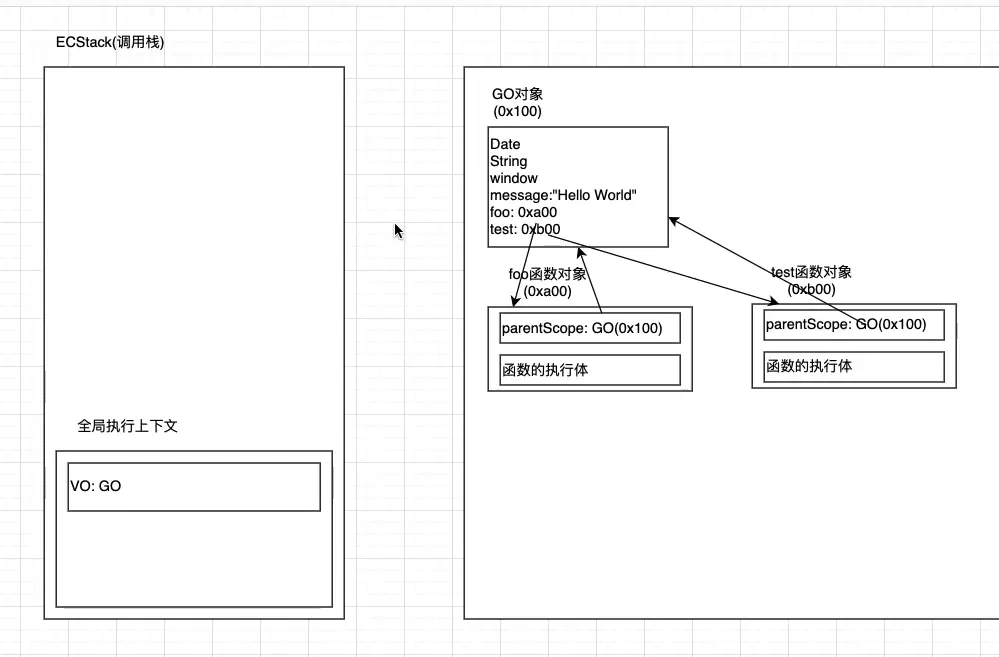 然后,这个时候解析全局代码,往全局GO里面加东西,原来的全局里面有Date,window,String等等,现在又加入message(undefined)foo(oxa00),test(oxboo)等变量。解析foo是函数,就创建一个函数对象 foo(oxa00),里面有函数的父级作用域,也就是全局的GO对象(ox100),还有