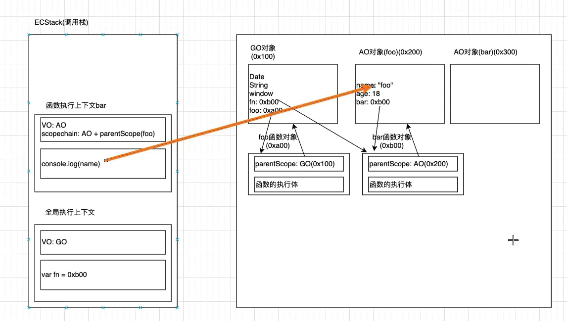 创建foo函数的函数执行上下文。往里面创建VO对象,VO指向AO对象。 创建一个foo函数的AO对象(ox200)。