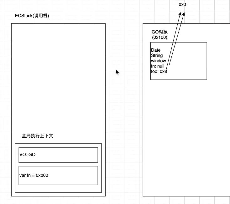 在执行所有代码之前,引擎会在内存里创建GO对象(ox100),它里面有String,window等内置对象。被提前创建好的。然后再去执行代码, GO对象是不会被销毁的