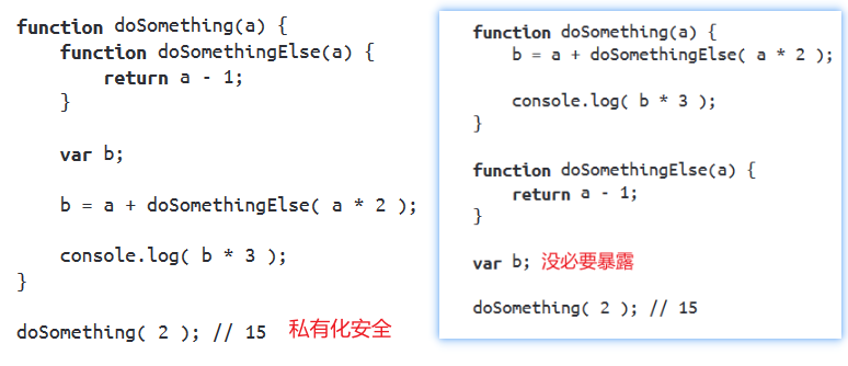 存在一些欺骗词法作用域的方法,这些方法在词法分析器处理过后依然可以修改作用域,但是这种机制可能有点难以理解。事实上,让词法作用域根据词法关系保持书写时的自然关系不变,是一个非常好的最佳实践。