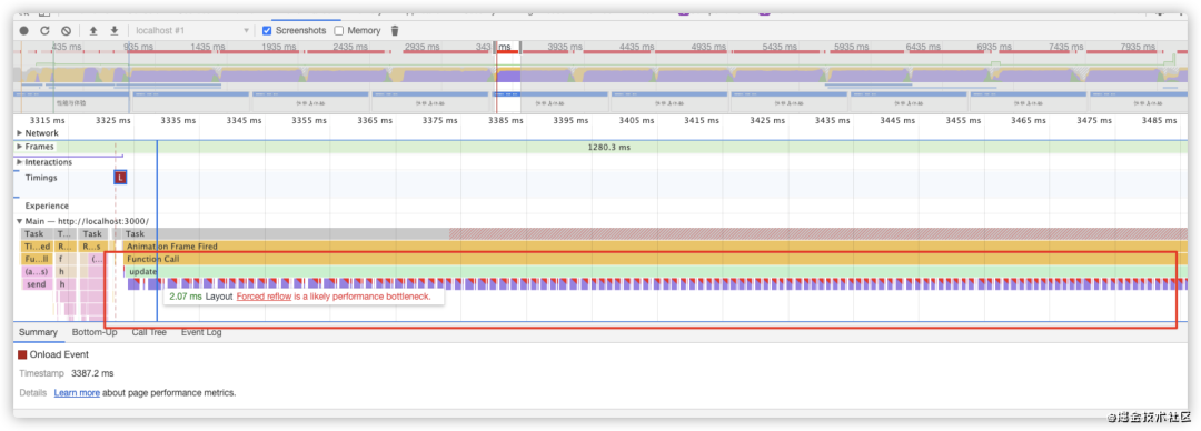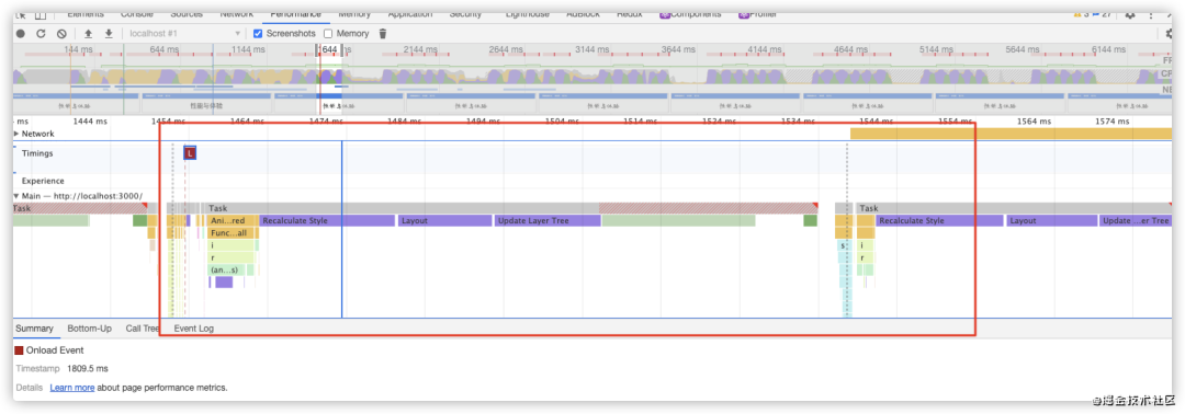 performance分析结果,load 事件之后也没有了那么多的红色标记