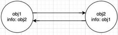 当函数 func 执行结束后,返回值为 undefined,所以整个函数以及内部的变量都应该被回收,但根据引用计数方法,obj1 和 obj2 的引用次数都不为 0,所以他们不会被回收。