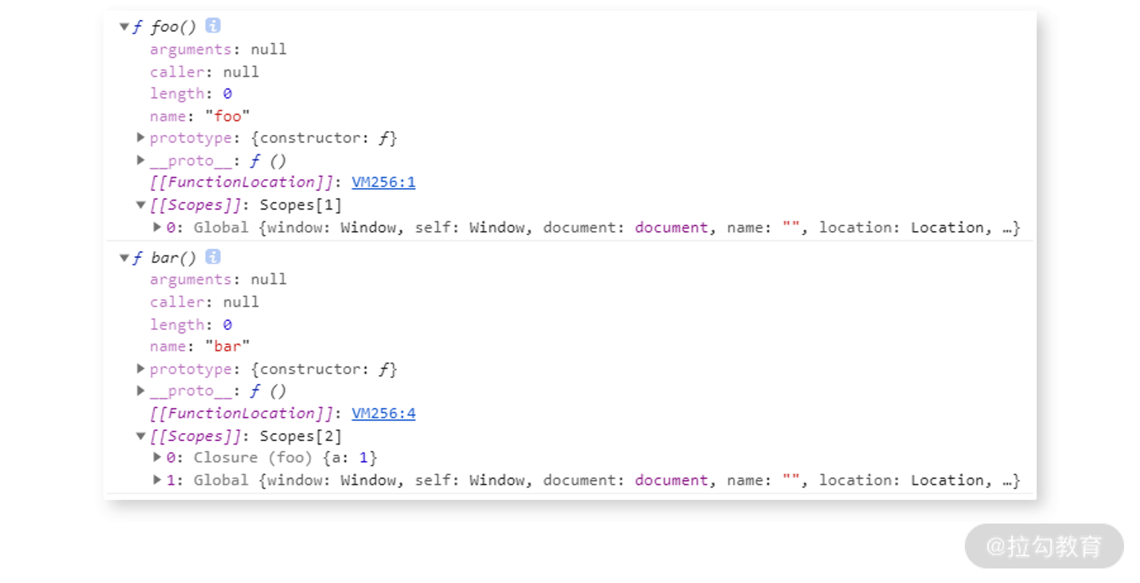 如果我们想要访问内部函数的变量,可以通过函数foo中的函数bar返回变量a,并将函数bar返回,这样我们在全局环境中也可以通过调用函数foo返回的函数bar,来访问变量a: