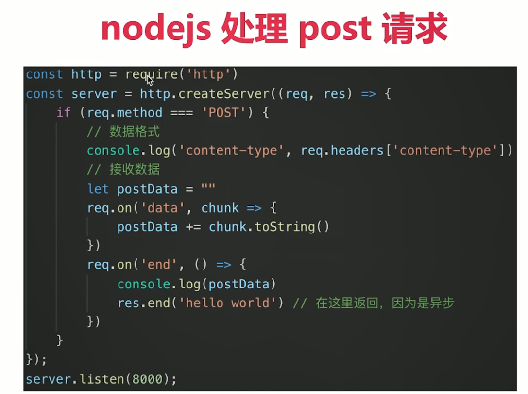 | res.writeHead | 请求头设置和返回内容 | res.writeHead(404,{"Content-type":"text/plain"}) |