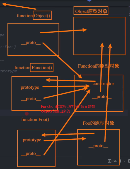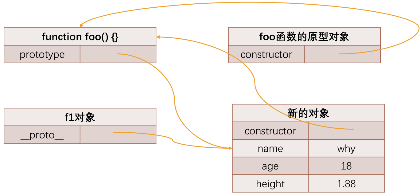f.__proto__对象==F.prototype,f.__proto__.constructor==F (其实实例和构造函数之间没有联系的!通过原型作为桥梁)