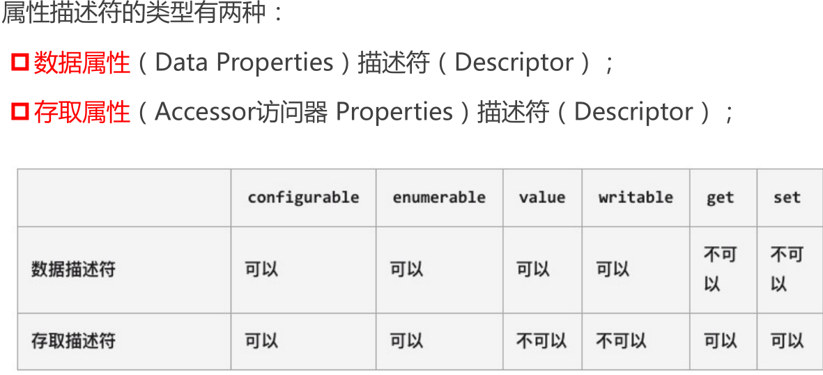 - Object.defineProperty() 包括数据描述符和存取描述符, 属性描述符必须是数据描述符或者存取描述符两种形式之一,不能同时是两者 两者均具有以下两种键值: