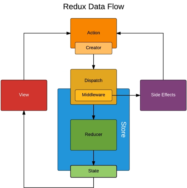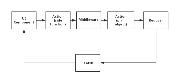 redux增加中间件处理副作用后的数据流大致如下:UI——>action(side function)—>middleware—>action(plain)—>reducer—>state—>UI