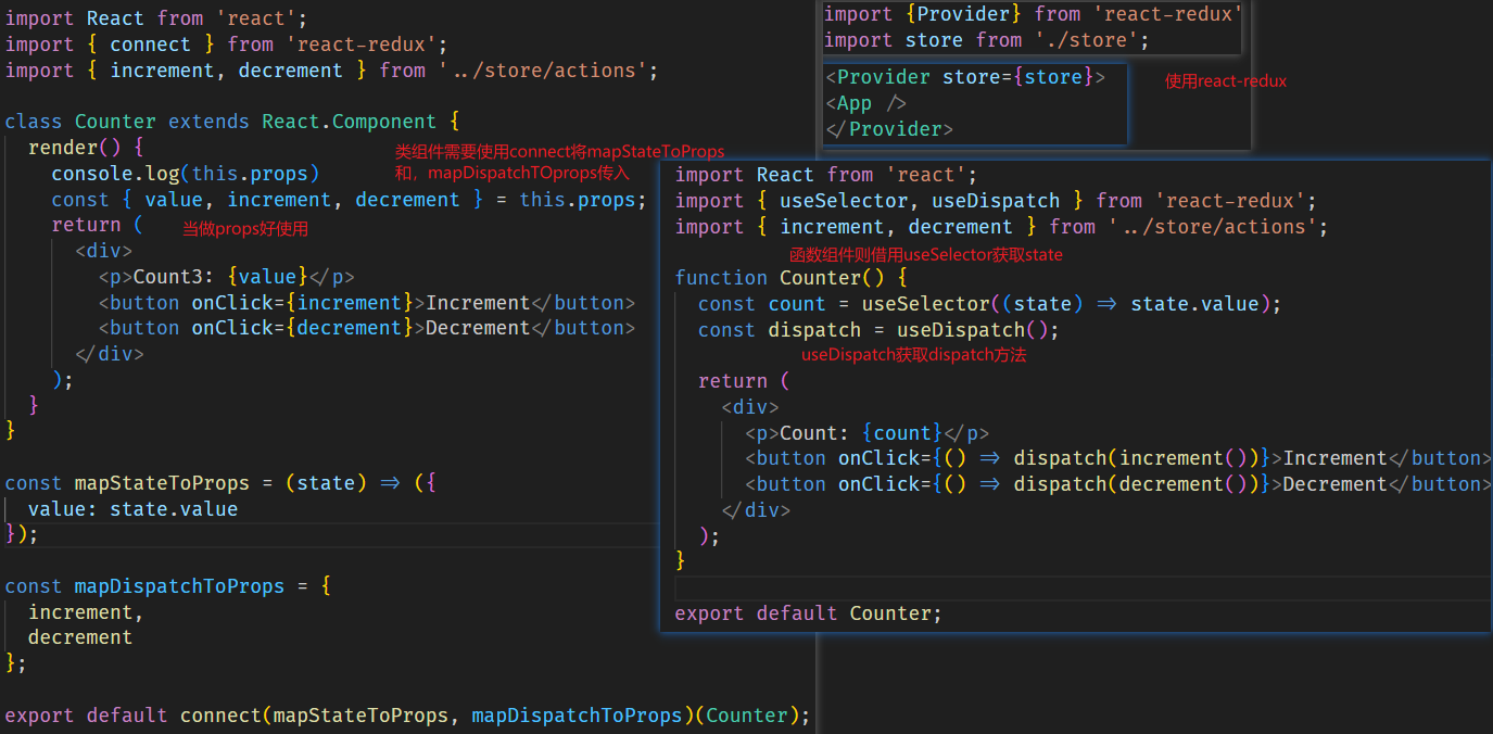 - 在组件中使用:在你的 React 组件中,可以使用 useSelector 和 useDispatch 钩子来访问 Redux store 中的状态和派发 actions。