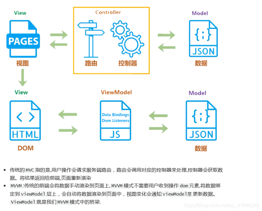 这种模式实现了 Model 和 View 的数据自动同步,开发者只需专注对数据的维护操作即可,不需要自己dom。