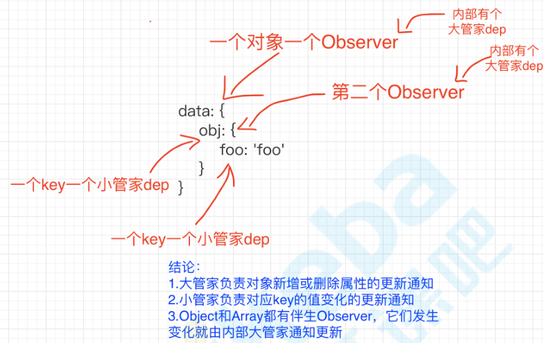 Observer对象根据数据类型执行对应的响应化操作 defineReactive定义对象属性的getter/setter,getter负责添加依赖,setter负责通知更新