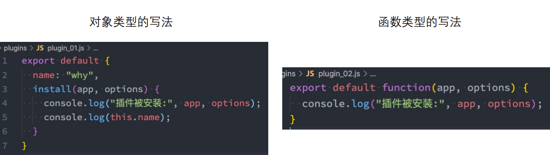 - 对象类型:一个对象,但是必须包含一个 install 的函数,该函数会在安装插件时执行;